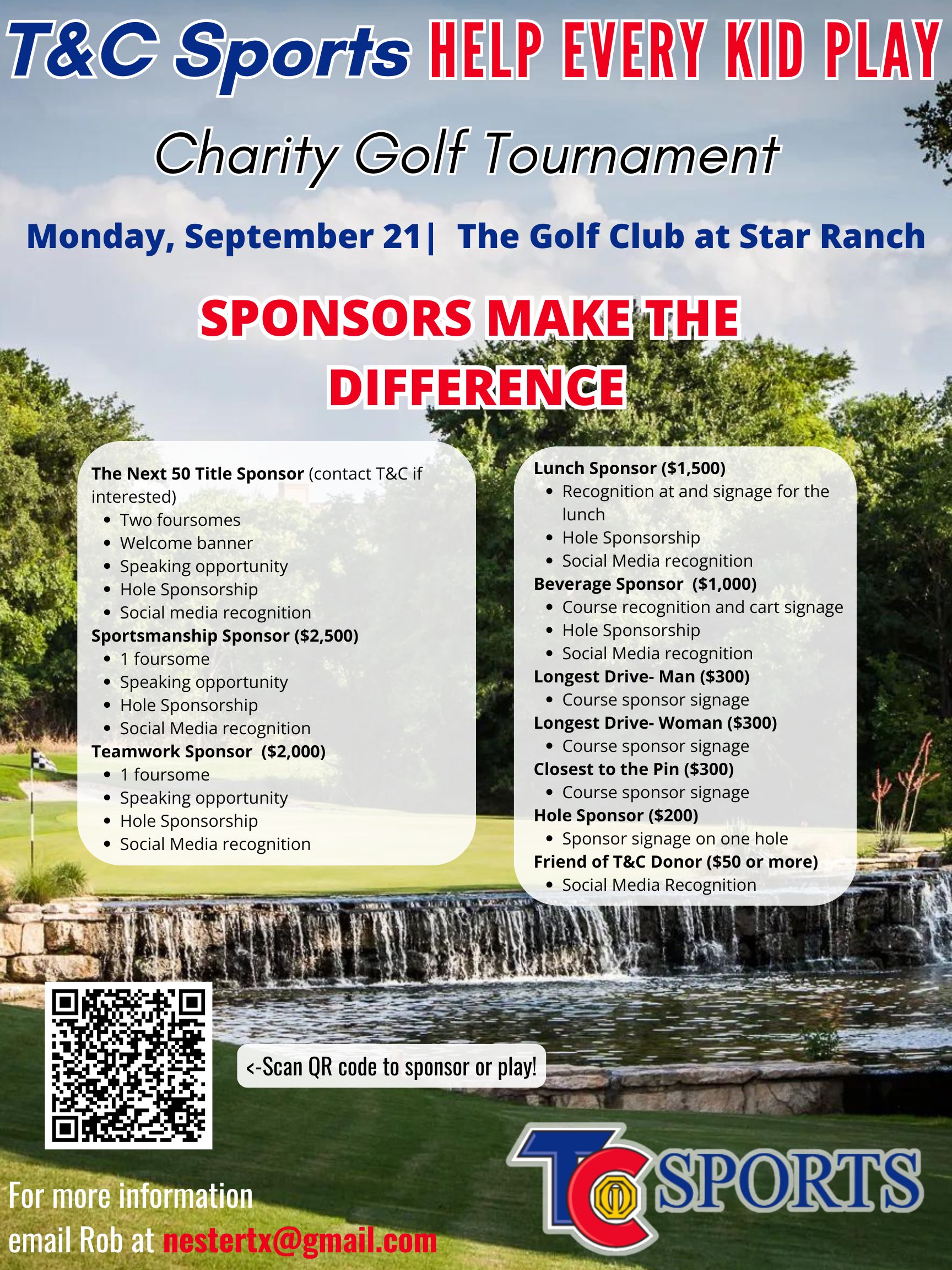 Please mark your calendars for Monday, September 21st, a 1:30pm shotgun start, at The Golf Club at Star Ranch. We appreciate your participation in our past events and hope you can join us again this fall for T&C’s ‘Help Every Kid Play’ tournament.